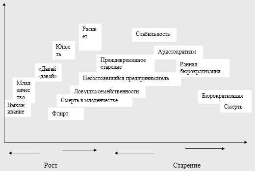 1. Рождение или ранний рост, здесь существует доминирование основателя или семьи, а также проходит фаза преемственности.
