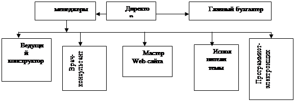 Для предприятия характерна линейно-функциональная организационная структура, т.е. предприятие, состоит из подразделений, каждое из которых выполняет свою функцию. Однако, в связи с тем, что предприятие малое, каждое из подразделений представлено одним, двумя, или небольшим числом сотрудников, каждый из которых подчиняется директору предприятия.