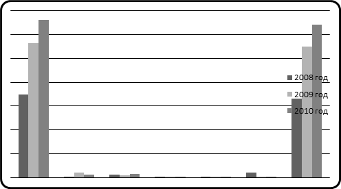 Представим данные таблиц в виде гистограммы для сравнения показателей за 2008, 2009 и 2010 год: