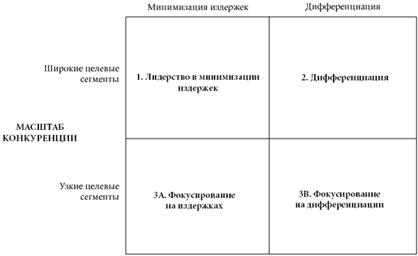 Два основных типа конкурентных преимуществ в сочетании с той сферой деятельности, в которой компания пытается добиться этих преимуществ, позволяют ей выработать три наиболее общих конкурентных стратегии, с помощью которых можно добиться уровня эффективности, превышающего средние показатели в индустрии: лидерство в минимизации издержек, дифференциация и фокусирование. Стратегия фокусирования имеет две разновидности: фокусирование на издержках и фокусирование на дифференциации. Эти три стратегии представлены на рис. 1.