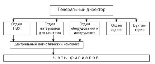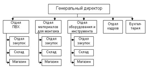 Расширение деятельности компании привело к появлению новых ассортиментных групп: оборудование и инструмент, строительный крепеж, системы остекленения балконов и лоджий. Эти изменения нашли свое отражение в изменении структуры компании: появилась необходимость разделить деятельность по закупке и сбыту отдельных групп товаров. В связи с этим организационная структура компании приняла вид дивизионально-продуктовой (рис. 2.3).
