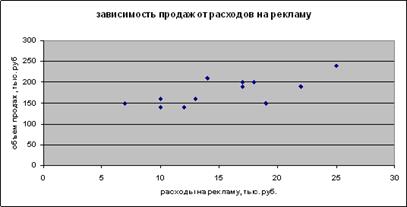 Исходя из построенного графика видно, что между расходами на рекламу и объемом продаж наблюдается прямая зависимость. Зависимость кроме того, достаточно тесная, что позволяет сделать вывод, полученный ранее, что увеличение затрат на рекламу приводит к росту объема продаж.