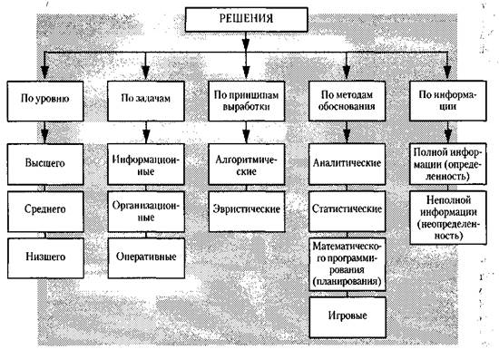 По методам обоснования решения бывают аналитические, статистические, математического программирования и игровые, а по характеру исходной информации – в условиях определенности (полной информации) или в условиях неопределенности (неполной информации).