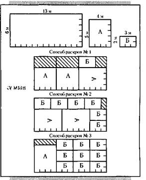 Прежде всего, нужно установить все возможные способы раскроя наших листов по требуемым заготовкам. Начнем с того, что постараемся получить с одного листа как можно больше заготовок А – они крупнее, чем Б, и для них труднее подыскать место на листе. Оказывается, однако, что более трех заготовок А с листа выкроить невозможно. Исходя из этого предусмотрим способы раскроя для получения трех, двух и одной заготовки А и наибольшего возможного количества заготовок Б с листа. Каждому способу дадим номер: