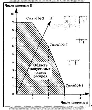 Очевидно, тот, которому соответствует точка, наиболее отдаленная от начала координат, – ведь при этом число заготовок будет наибольшим. Этот план дает точка, лежащая на пересечении луча ОЛ с границей области допустимых планов – линией, соединяющей способы № 2 и № 3. Она находится как раз посередине между упомянутыми способами. Итак, оптимальный план раскроя заключается в том, что половина листов кроится способом № 2, а половина – способом № 3.