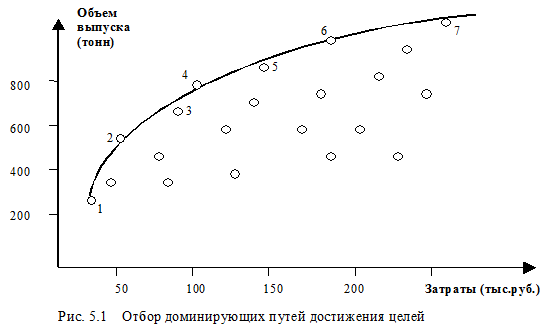 Доминирующие варианты (рис. 5.1) соединены кривой. О каждом из доминирующих вариантов можно сказать, что среди различных путей достижения поставленных целей нет других, которые обеспечивали бы получение данного результата с меньшими затратами или при данных затратах позволяли бы достичь больших результатов. Однако этот способ не позволяет руководителю определить, какому из доминирующих вариантов следует отдать предпочтение.