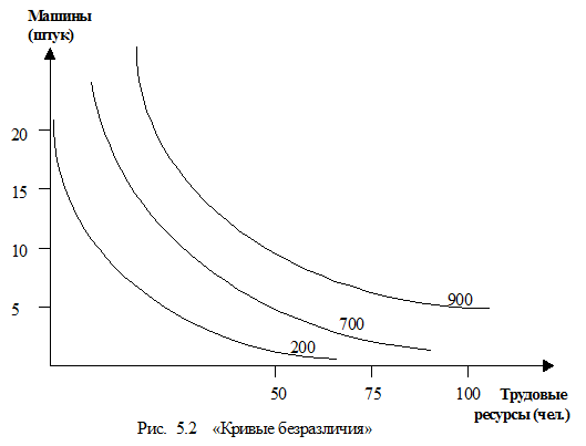Рассмотрим более подробно выбор лучшей стратегии с помощью “кривых безразличия” на примере определения оптимальной производственной программы. На рис. 5.2 приводятся такие кривые, построенные исходя из возможности производства различного количества продукции (от 200 до 900 единиц) при различных сочетаниях потребных трудовых ресурсов и используемого оборудования.