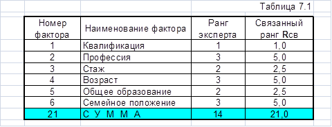 Например, эксперту предлагается проранжировать по важности факторы, используемые в отделе труда и заработной платы предприятия (см. таблицу 7.1). Факторам 3 и 5, поделившим между собой второе и третье места приписывается связанный ранг