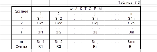 При этом матрица опроса преобразуется в матрицу преобразованных рангов (Таблица 7.3), для каждого столбца которой определяется сумма