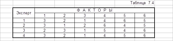 Для примера рассмотрим ситуацию: четыре эксперта проранжировали по важности три фактора из таблицы 5.1. Матрица опроса приведена в таблице 7.4.