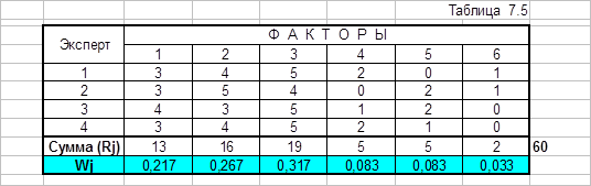 По данным таблицы 7.3 определяется относительный вес каждого фактора по всем экспертам: