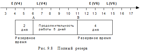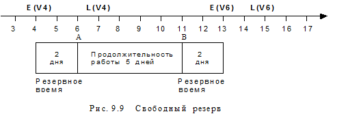 может быть выполнена в любое время в промежутке 11 дней, т.е. имеется 6 резервных дней. Это хорошо иллюстрируется на графике с временной осью (рис.9.8).